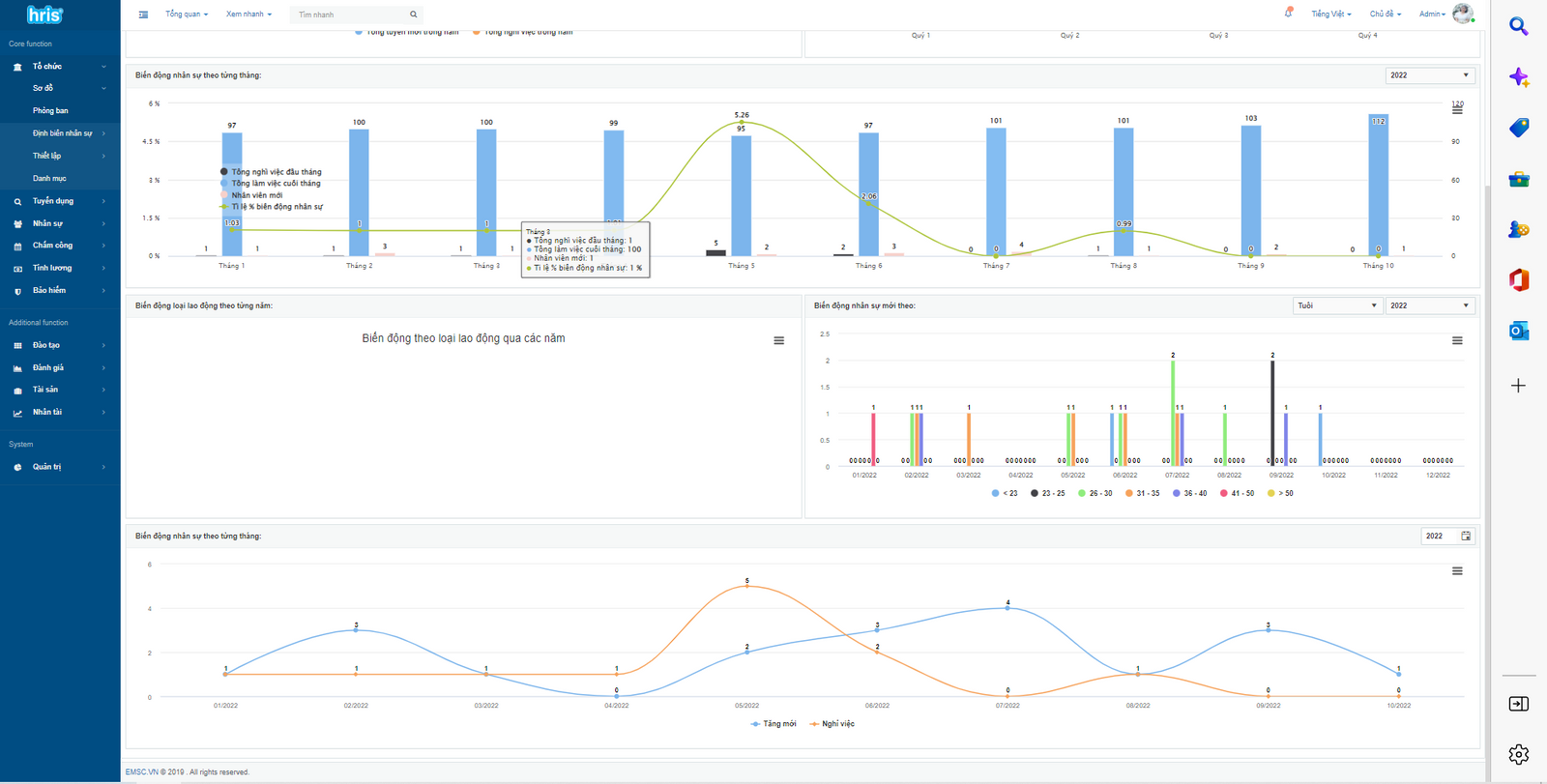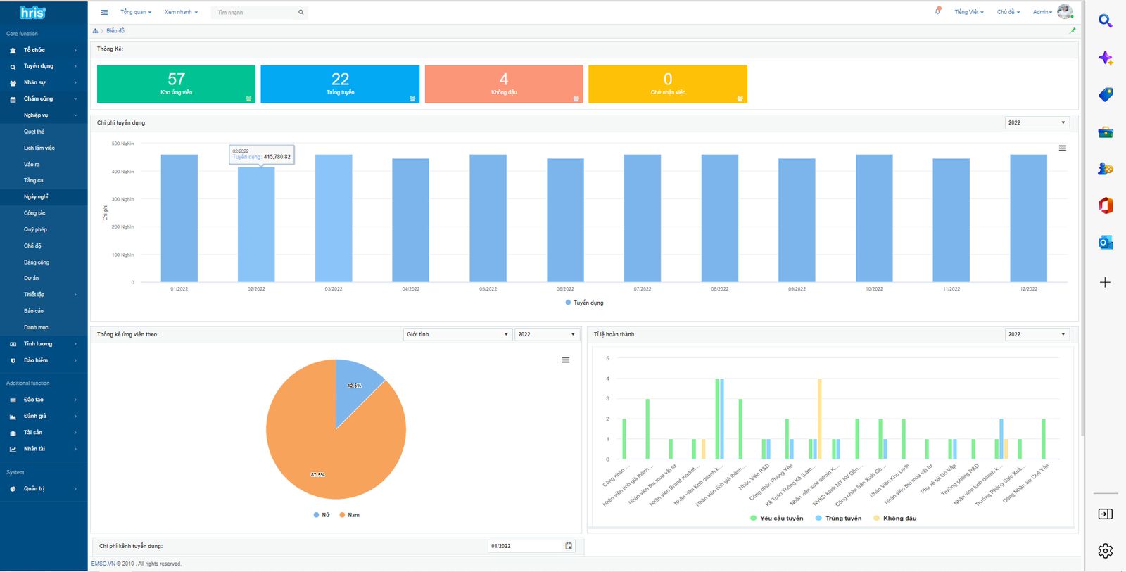 Chức năng tyển dụng của HRIS giúp bộ phận nhân sự chuyển đổi số quá trình tuyển dụng. Thay vì làm thủ công và không lưu trữ thông tin như trước đây thì toàn bộ quy trình, từ khâu lập kế hoạch đến gửi thư mời, phỏng vấn, kết quả, nhận việc gần như được tự động hóa đến 90% bởi HRIS. Bên cạnh đó, hệ thống HRIS cung cấp cho người dùng nhiều tính năng thống kê, phân tích và báo cáo như phân tích nhu cầu tuyển dụng, phân tích quá trình tuyển dụng, thiết lập định biên nhân sự...giúp công tác tuyển dụng chuyên nghiệp và hiện đại hơn.